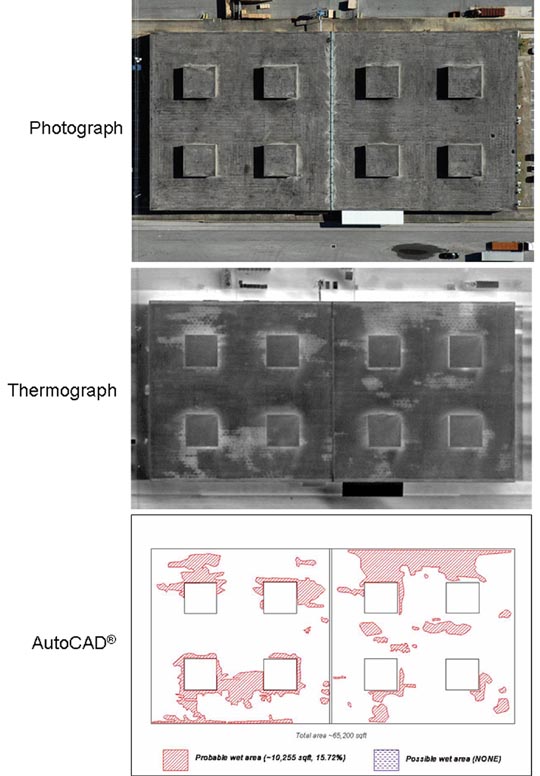 Subsurface wet areas in a flat or low-sloped roof show up as lighter